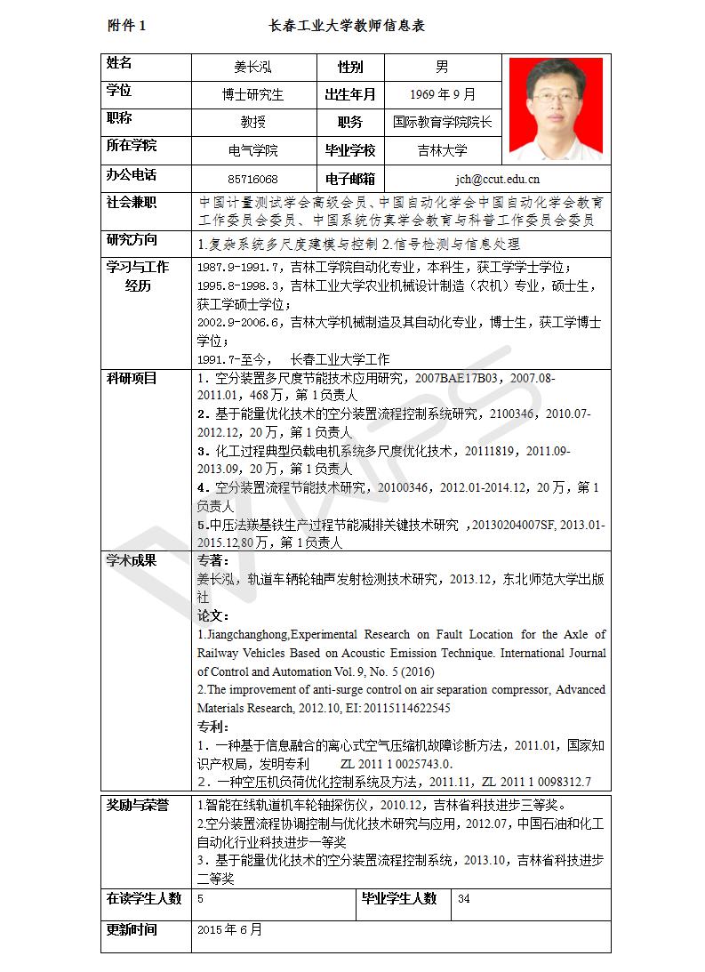 姜长泓教授,博士,现为tyc122ccVIP学科带头人,国际教育公司经理;长期工作在教学、科研一线,1996年任讲师,2001年任副教授,2004年破格晋升教授;吉林省第八届青年科技奖获得者、国家科技支撑计划课题负责人、吉林省第四批拔尖创新人才(第三层次)、长春市第五批有突出贡献专家、长春市第二届“百名优秀科技工作者”。目前担任中国自动化学会中国自动化学会教育工作委员会委员、中国系统仿真学会教育与科普工作委员会委员、中国计量测试学会高级会员。