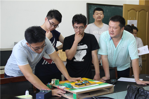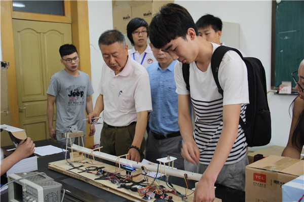 本届竞赛得到了校、院各级领导的高度重视,公司对大赛的赛前组织、现场测试、赛会服务等方面做了大量的工作,确保了比赛的顺利进行。此次大赛设置自动飞行旋翼飞行器、空间声源定位及指示系统、圆球直径识别及平衡控制装置、三相变频调压装置、小型直流电动机的转速测量与控制装置、物体密度测量装置六个选题。比赛开始前,为统一评比标准,公平测评,各选题的专家评审分别召开小组会议,详细统一了测评及打分规则。大赛开始,各个参赛队伍上交作品。参赛作品上交完毕后,各个队伍按照顺序进行演示,并由专家对演示作品进行测试、评审、打分。第一个选题的评审老师陈戈华说到:孩子们做的飞行器有大有小,不论大小,做的都很精细,有两组做的特别棒,有两组虽说遗憾没有飞起来,但是亲手动手设计一次,收获也是非常大的。参赛同学李镇讲起自己的参赛项目时说:“我们组的设计项目是物体密度测量装置,设计装置的时候,一个小的器件或者连接出了偏差,都会使测量结果产生误差,所以要经过反复的调试,锻炼了我们的动手能力,激发了创新意识。”