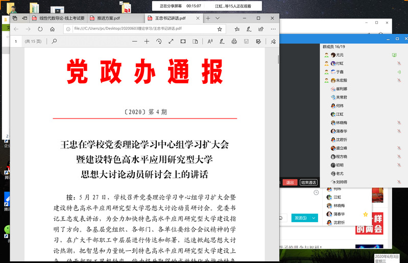 本网讯(通讯员李昆)按照公司党委关于理论学习相关要求,结合公司工作实际,6月3日下午,电气与电子工程公司党委组织全体教师专题学习。学习内容有:全国“两会”精神、公司党委书记王忠5月27日在公司党委理论学习中心组学习扩大会暨建设特色高水平应用研究型大学思想大讨论动员研讨会上的讲话精神和《特色高水平应用研究型大学建设思想大讨论推进方案》。各党支部以在线集中学习和自主学习等方式对上述内容进行了全面解读,并深入领会内涵实质。