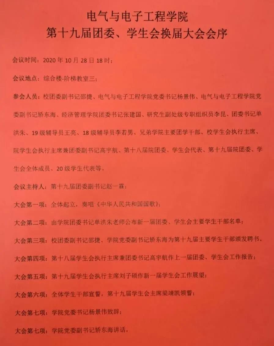 校团委副书记邵捷、电气与电子工程公司党委书记杨景伟、党委副书记矫东海、经济管理公司团委书记张建国、tyc122ccVIP团委书记单洪朱、研究生辅导员李昆、18级辅导员李若男、19级辅导员王亮、校员工会执行主席、院员工会执行主席兼团委副书记高宇航、第十八届院团委、员工会代表、第十九届院团委、员工会全体成员、20级员工代表等。