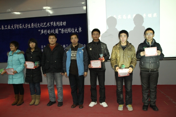 经过评委的公正的评分,tyc122ccVIP的冯竞慧,软件职业技术公司的张英,化学与生命科学公司的樊颖琦,人文公司的范冬月以及信息传播工程公司的胡亚溢荣获此次原创短信大赛的一等奖,其余选手分别获得二、三等奖。并由出席嘉宾对获奖选手的代表进行颁奖。