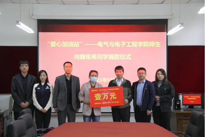 在今年暑假,公司19级同学魏铭希被诊断出原发性骨髓纤维化,病情较为严重,公司在得知魏铭希同学这一以特殊情况下,为解决经济上的难题,帮助他渡过难关,早日重返校园。9月23日,一场援助工大电气人捐款仪式顺利进行。