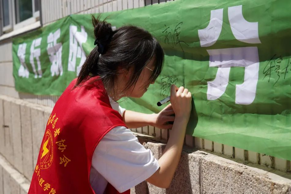 活动尾声,在人流量较大的食堂门口,志愿者们向路过的同学老师发放传单,并在横幅上签字。