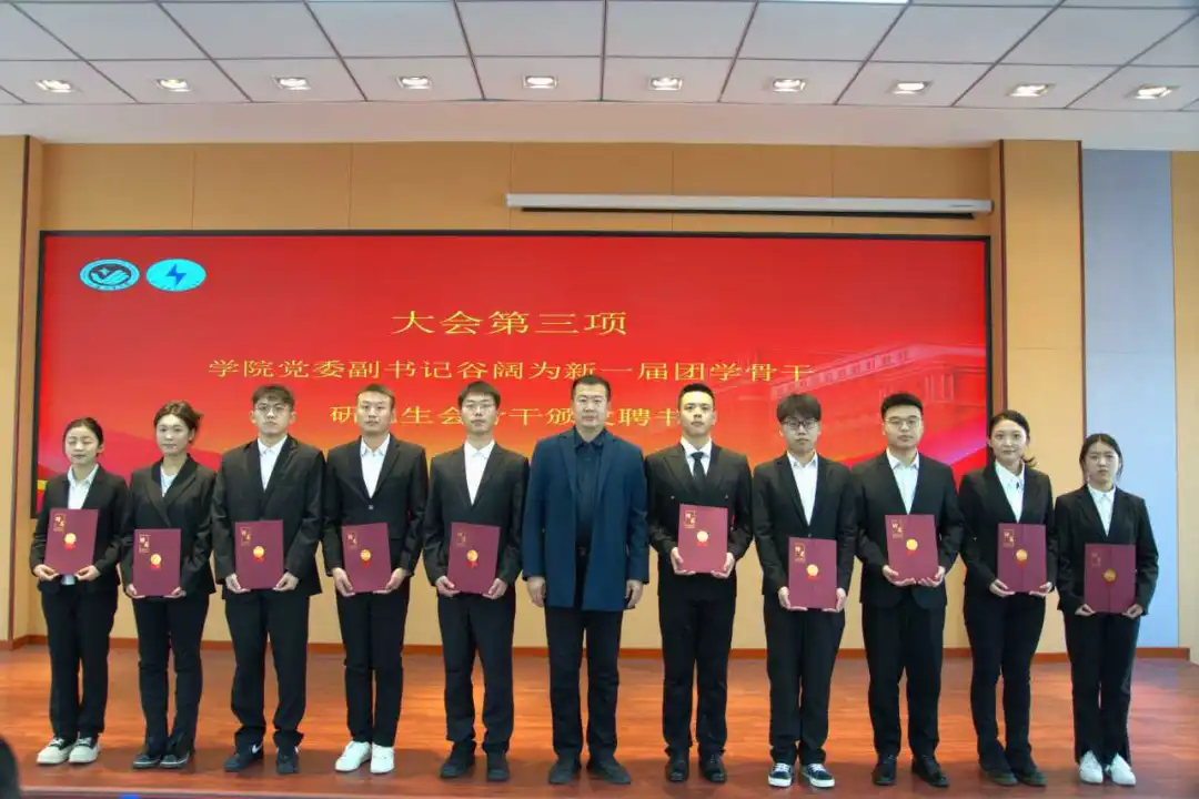 大会第三项:公司党委副书记谷阔老师为新一届团学骨干、研究生会骨干颁发聘书