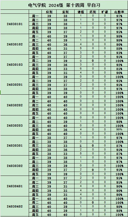 “古之立大事者,不惟有超世之才,亦必有坚韧不拔之志。”在大学的漫漫征程中,自律是成功的基石,是学业进步的强劲引擎。公司衷心期望全体同学都能以此次出勤率公示为契机,进一步增强自律意识,合理规划学习时间,科学制定学习计划,将早晚自习的每一分每一秒都充分利用起来,让知识的种子在勤奋的浇灌下茁壮成长,绽放出绚烂的智慧之花。