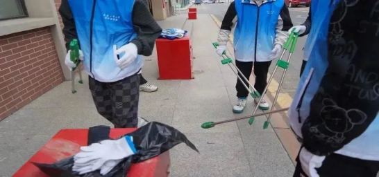 在社区负责人的指导下,同学们戴着一次性乳胶手套,拿着铲刀、扫帚等工具,开始了当天的志愿工作。工作内容主要包括:清理社区和辖区街道的杂物;清理当地绿化带和覆土网内的白色垃圾;铲除街区单元门和楼道的小广告。