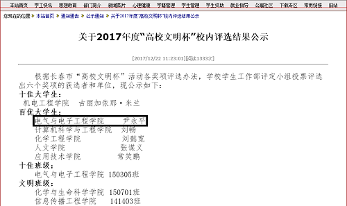 公司尹永平同学在二〇一七年度“高校文明杯”竞赛活动中被评为“百优老员工”