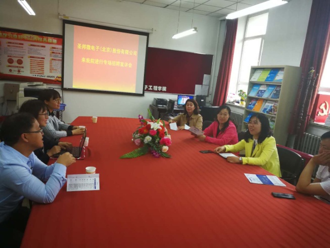 (通讯员 张雪峰)6月4日(周二)下午13点30分在tyc122ccVIP303会议室,公司党委书记王丽娜、经理韩顺杰、党委副书记矫东海、副经理刘帅师、研究生辅导员李昆、研究生秘书张雪峰等人接待了圣邦微电子(北京)股份有限公司人力资源、测试工程师一行三人。会议首先就贵公司的用人需求与公司研究生的培养、就业去向等方向展开了研讨。