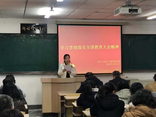 本网讯(通讯员鲍禹松)为全面准确把握全国教育大会的战略精神,贯彻落实公司党委要求。12月12日下午,电气与电子工程公司党委在南湖校区1401室召开全院教师大会,专题学习贯彻落实全国教育大会精神。公司党委副书记李雁冰、科研处处长刘克平出席大会,公司全体教师参加。会议由公司党委书记王丽娜主持。