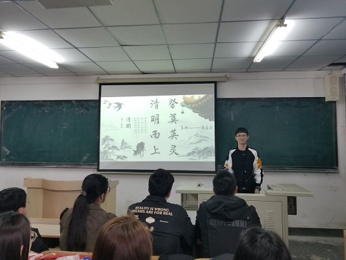 活动由院员工会副主席潘昱企主讲。首先,潘昱企给同学们普及了中国传统节日“清明节”的由来与习俗,提倡大家积极参与活动,缅怀先烈。随后,他向全体同学讲述了李大钊、刘胡兰、董存瑞、雷锋、金守儿等中国革命烈士的英勇事迹,并提议大家深刻悼念为了民族与国家而壮烈牺牲的烈士们。潘昱企认为,在中华民族面临生死存亡的危险时刻,是烈士们用自己的血肉之躯筑起了长城;是烈士们抛去了个人的一切,挺身而出,坚强而决绝,与敌人斗争;是烈士们将宝贵的生命无私地献给了祖国和人民,把满腔的热血洒遍祖国大地。他希望在座全体同学能够继承先烈遗志,努力学习,担负起属于当代青年应尽的责任。