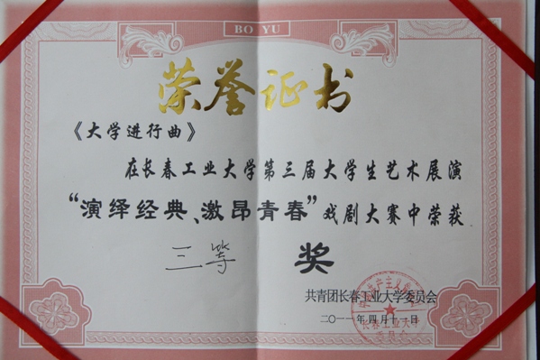 公司选送的《大学进行曲》、《梦想召回现实》获得tyc122ccVIP第三届老员工艺术展演系列活动之“演艺经典•激昂青春”戏剧大赛决赛三等奖、优秀奖。
