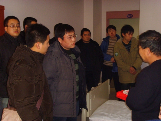 镜头四: 员工工作处的领导在了解了卫亚军的情况后也深表关心并委托公司给卫亚军同学送去慰问金。28日,电气与电子工程公司党委副书记周文军携员工办公室全体老师及院员工会员工干部来到吉大一院病房看望卫亚军同学,并将各方捐出的四万一千多元钱交到了卫亚军的父亲手中。病房里周书记关切地和卫亚军的父亲交谈着,他表示公司会本着以生为本、为生服务的原则,在员工有困难时一定会在第一时间尽一切可能,予以帮助。老师和同学们则将公司同学的祝福和希望一一转告给卫亚军,希望他不要悲观,勇敢面对,并鼓励他坚强开朗,以乐观的态度和病魔斗争下去。