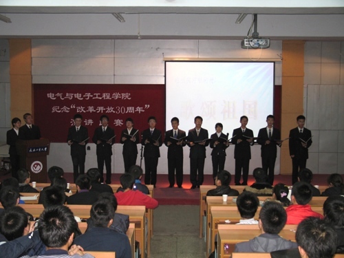 12月1日晚6:30,公司在南湖校区报告厅举办了主题为“为今天喝彩,为明天加油”——纪念“改革开放30周年”演讲比赛。应邀出席本次活动的嘉宾有公司员工办公室辅导员赵爽老师,校社团联合会主席张福厚,校广播站站长丛衡,校社团联合会秘书长徐志星,材料科学与工程公司员工会主席冯亚斌。 伴着一段题为“改革开放三十年精彩瞬间”影片的放映,拉开了此次比赛的帷幕。比赛共分为三个部分,分别为自我介绍,讲演阶段和诗歌朗诵。选手们的讲演慷慨激昂,他们讲诉了中国改革开放三十年来所取得的重大成就和中华儿女面对灾难,自强不息,众志成城的坚毅品质,激情的讲演振奋了在场的每一位观众。10位选手的诗歌朗诵《歌颂祖国》,让我们再一次感受到了中华民族的崛起和伟大复兴。最终来自080305班的刘思杰凭借出色的发挥获得一等奖,080308班的谭庆印和080307班的王谱铭分获二等奖。 此次活动是公司纪念改革开放三十周年重要活动之一,让同学们充分感受到了改革开放三十年来中国经历的沧桑巨变和光辉历程,让同学们真正意识到改革开放更是思想的改革,增强了同学们爱岗敬业、服务奉献社会的信心。