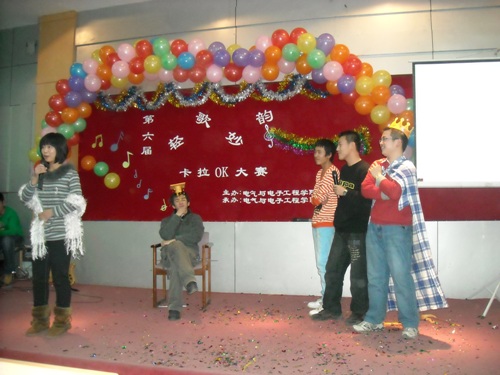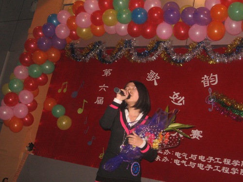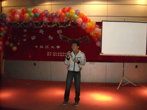 在富有浪漫情调的动画中十名参赛选手纷纷亮相。紧接着,参赛选手们分别演唱了《爱不爱我》、《你》、《听海》、《是非题》等歌曲。其间,董丰嘉、朱成龙、金多和张书瑜同学带来了舞蹈《DON’T PUSH》也为比赛的选手减轻了稍许的紧张。特别是《晚秋》、《倒带》等歌曲别有风味,博得了同学们的热烈掌声。为了活跃现场气氛,电气艺术团同学为观众表演小品《八戒闹天宫》,热情和幽默的演技引来了同学们的阵阵喝彩。比赛现场场面异常的热烈,各个亲友团更是使出浑身解数为选手们呐喊助威,最终080307班何亮以浑厚的嗓音,精湛的舞台技艺征服了现场的评委并获得第六届“轻歌妙韵”卡拉OK大赛一等奖。