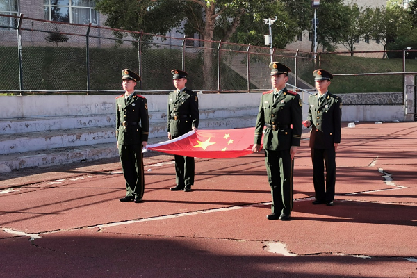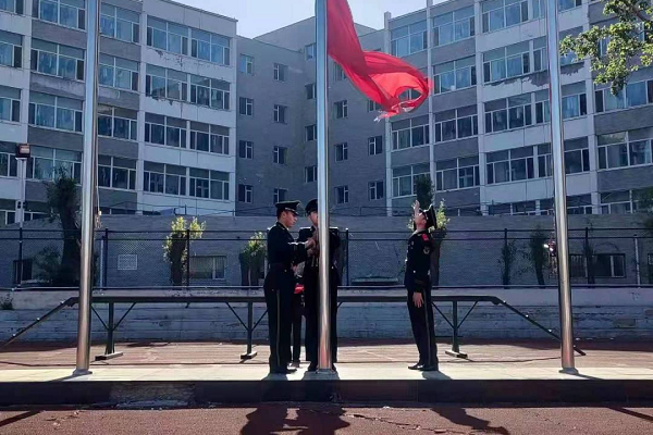 升旗仪式由四名退役老员工担任护旗手,伴随着雄壮的国歌声,在同学们的注视下,五星红旗缓缓升起,迎风飘扬。“青马班”优秀学员卢子旗,代表员工在国旗下承诺,所有同学将继续努力,加强对党史的学习与感悟,用自己的知识和行动为国家的文明富强添砖加瓦,为民族复兴贡献青春和热血。